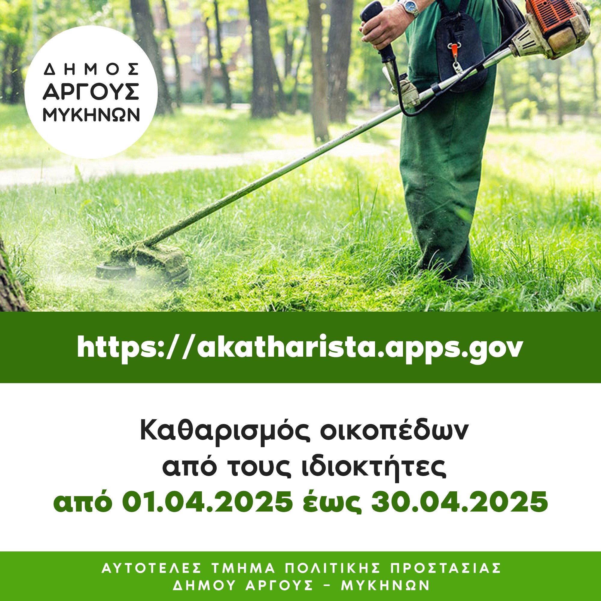 Το Αυτοτελές Τμήμα Πολιτικής Προστασίας του Δήμου Άργους – Μυκηνών, με αφορμή την έναρξη της αντιπυρικής περιόδου 2025 από 1/5/2025 έως 30/10/2025 υπενθυμίζει στους Δημότες του τις διατάξεις της Αποφ. 21837/Φ700/20/2Φ24/24, ΦΕΚ – 2695/Β/9-5-24 για την υποχρέωση καθαρισμού των οικοπέδων τους και για την υποβολή δήλωσης καθαρισμού, ακολουθώντας τους συνδέσμους: