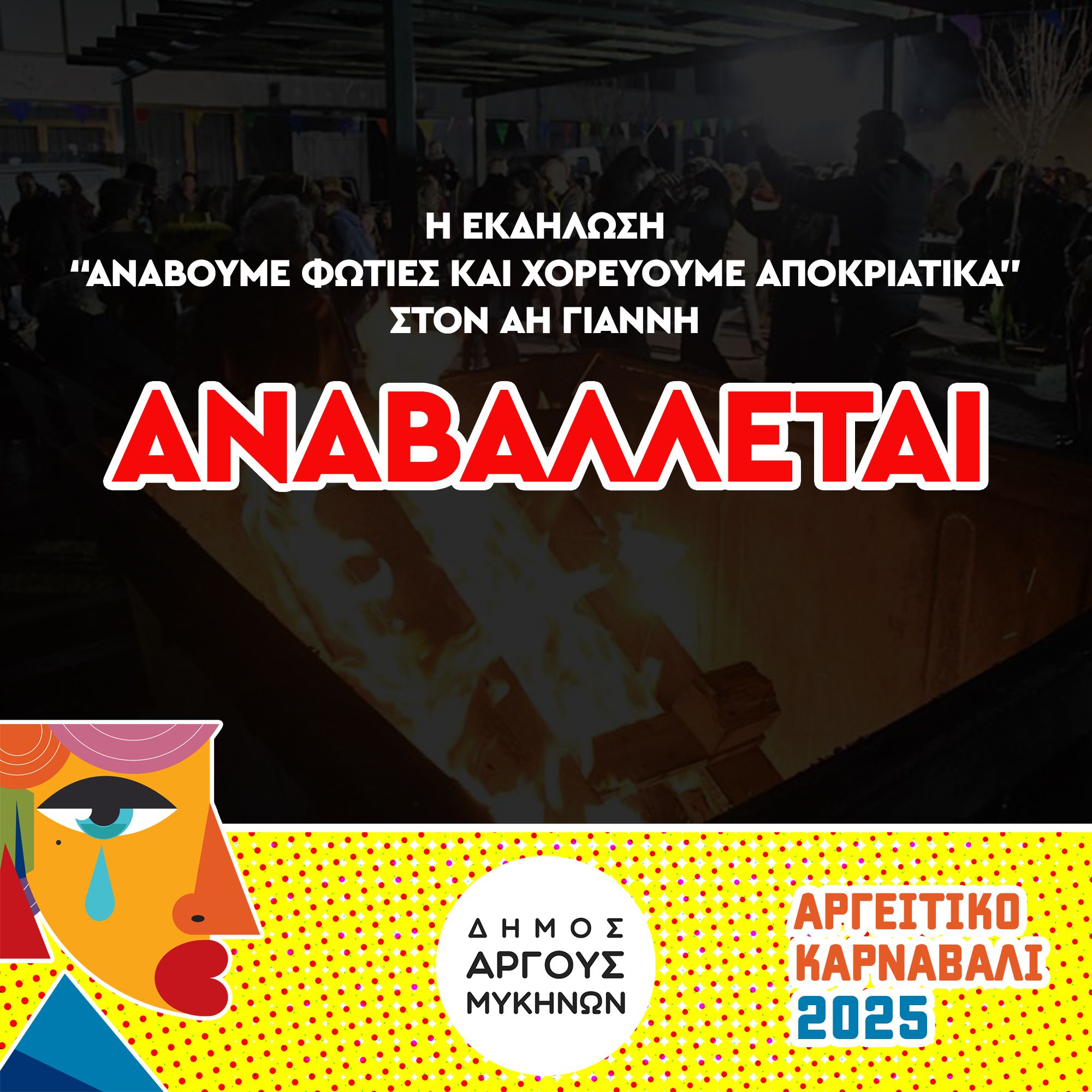 Σας ενημερώνουμε ότι η προγραμματισμένη εκδήλωση “Ανάβουμε φωτιές και χορεύουμε Αποκριάτικα” στον Αη Γιάννη, που είχε προγραμματιστεί για την Κυριακή στις 19:00, αναβλήθηκε λόγω κακοκαιρίας.