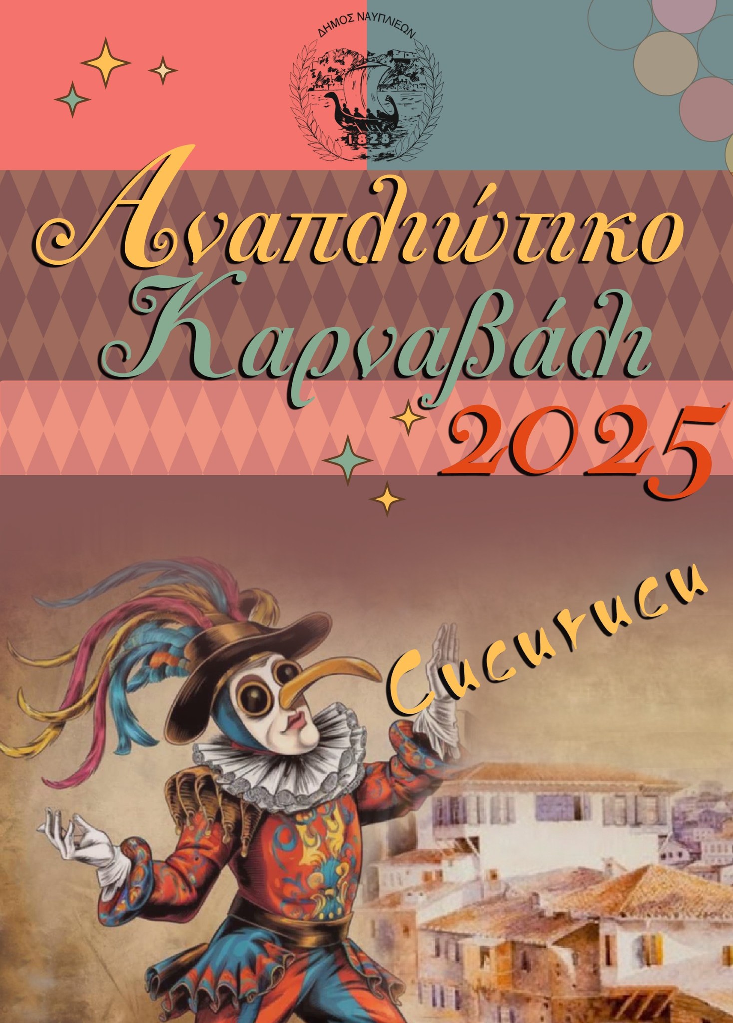 Το Αναπλιώτικο Καρναβάλι, αναγεννημένο από τα Βενετσιάνικα δρώμενα και την Comedia Del’ Arte , συναντά φέτος εικόνες της καθημερινότητας τις οποίες σατιρίζει , εκφράζοντας χαρά και αισιοδοξία , δημιουργώντας τα Καρναβαλομπλεξίματα.