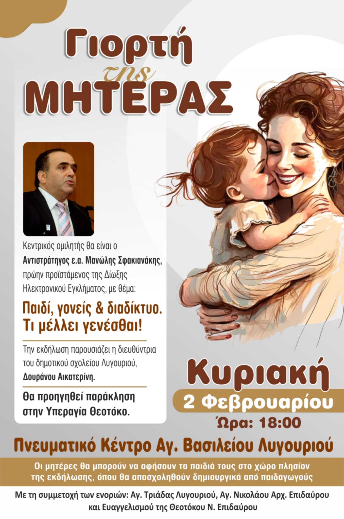 Η Ενορία Αγίας Τριάδας Λυγουριού σας προσκαλεί στην εκδήλωση για τη “Γιορτή της Μητέρας” που θα πραγματοποιηθεί την Κυριακή, 2 Φεβρουαρίου 2025, στις 18:00, στο Πνευματικό Κέντρο Αγίου Βασιλείου στο Λυγουριό. Στην εκδήλωση θα πραγματοποιηθεί ομιλία από τον Αντιστράτηγο ε.α. Μανώλη Σφακιανάκη, πρώην προϊστάμενο της Δίωξης Ηλεκτρονικού Εγκλήματος, με θέμα: “Παιδί, γονείς & διαδίκτυο: Τι μέλλει γενέσθαι!”