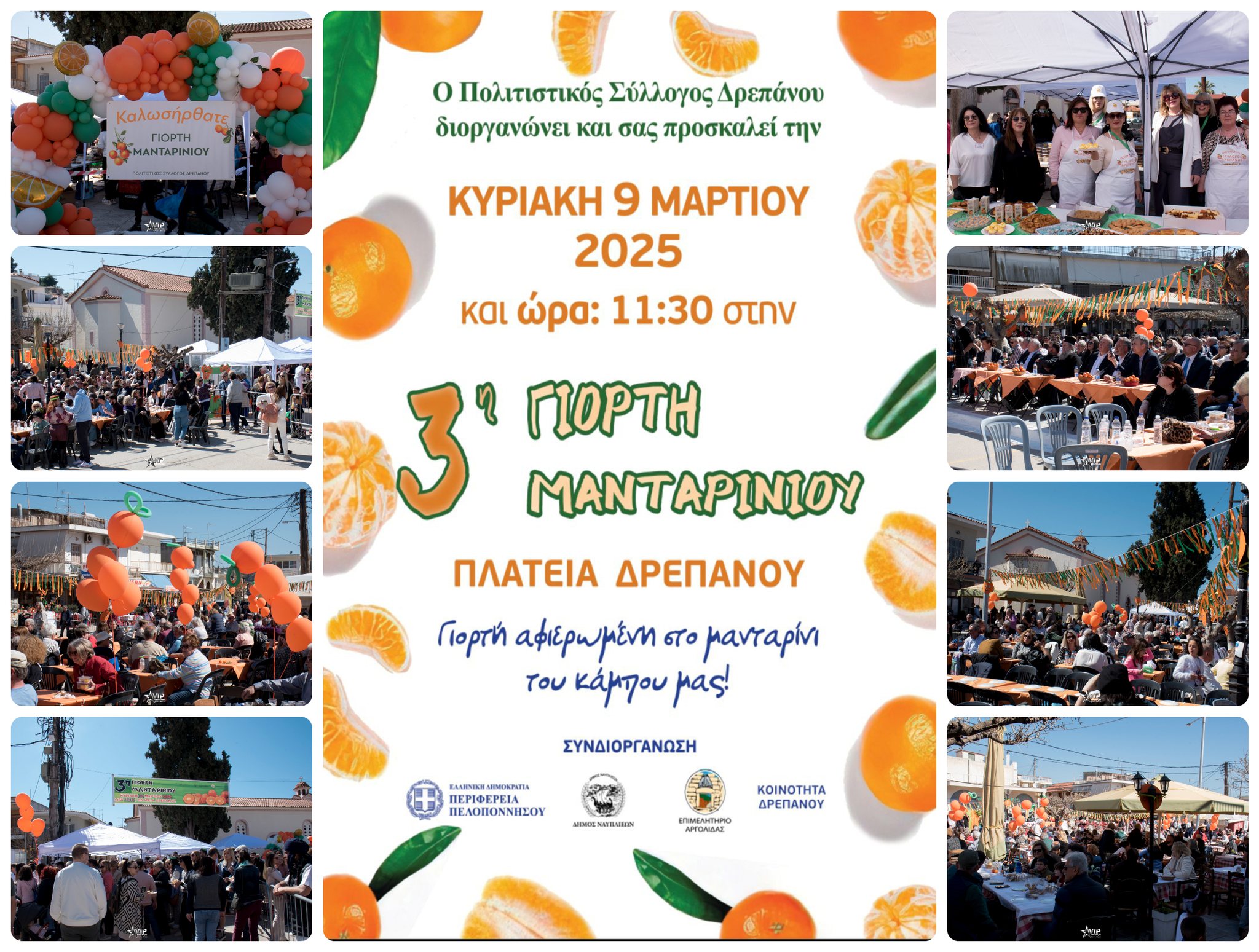 Η γιορτή, που διοργανώθηκε από την Περιφέρεια Πελοποννήσου, το Επιμελητήριο Αργολίδας, τον Δήμο Ναυπλιέων και την Κοινότητα Δρεπάνου, ανέδειξε την τοπική παραγωγή και την ποιότητα του μανταρινιού της περιοχής.