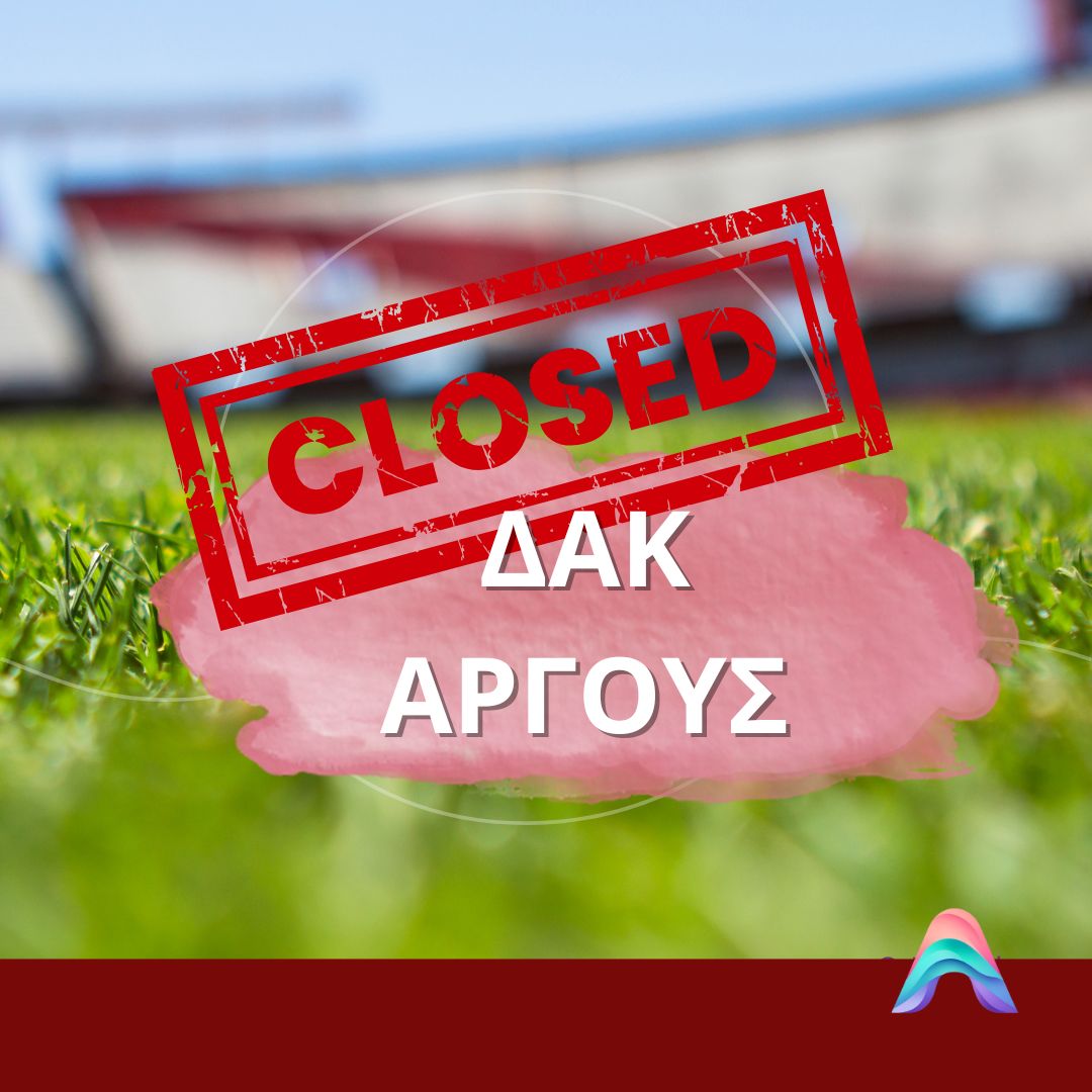 Γίνεται γνωστό ότι το Σάββατο 08 Μαρτίου 2025 το ΔΑΚ Άργους θα παραμείνει κλειστό για το κοινό από τις 09:00 έως 17:00 λόγω ποδοσφαιρικού αγώνα για την 3η αγωνιστική των Play Outs της Super League 2.