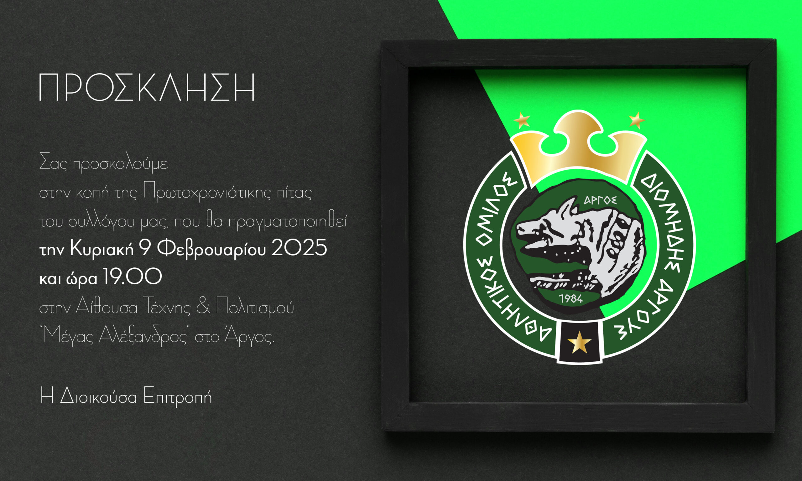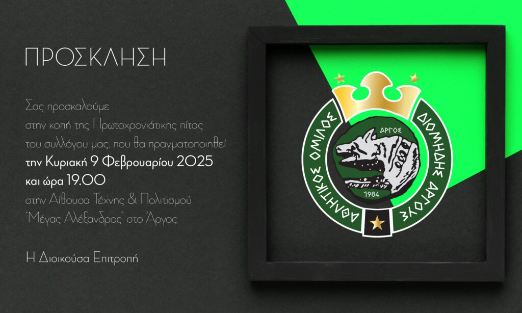 Την Κυριακή 9 Φεβρουαρίου 2025 και ώρα 19:00, στην Αίθουσα Τέχνης και Πολιτισμού “Μέγας Αλέξανδρος” στο Άργος, θα πραγματοποιηθεί η κοπή της Πρωτοχρονιάτικης πίτας της ανδρικής ομάδας και των τμημάτων υποδομής του συλλόγου μας.