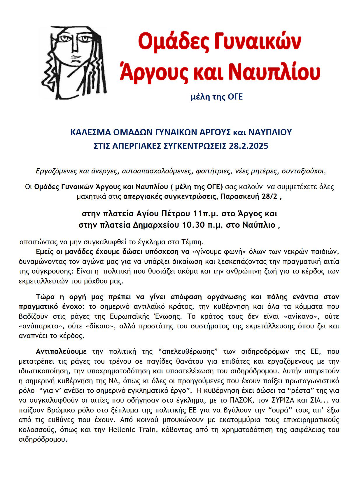 Οι Ομάδες Γυναικών Άργους και Ναυπλίου ( μέλη της ΟΓΕ) σας καλούν να συμμετέχετε όλες μαχητικά στις απεργιακές συγκεντρώσεις, Παρασκευή 28/2 ,