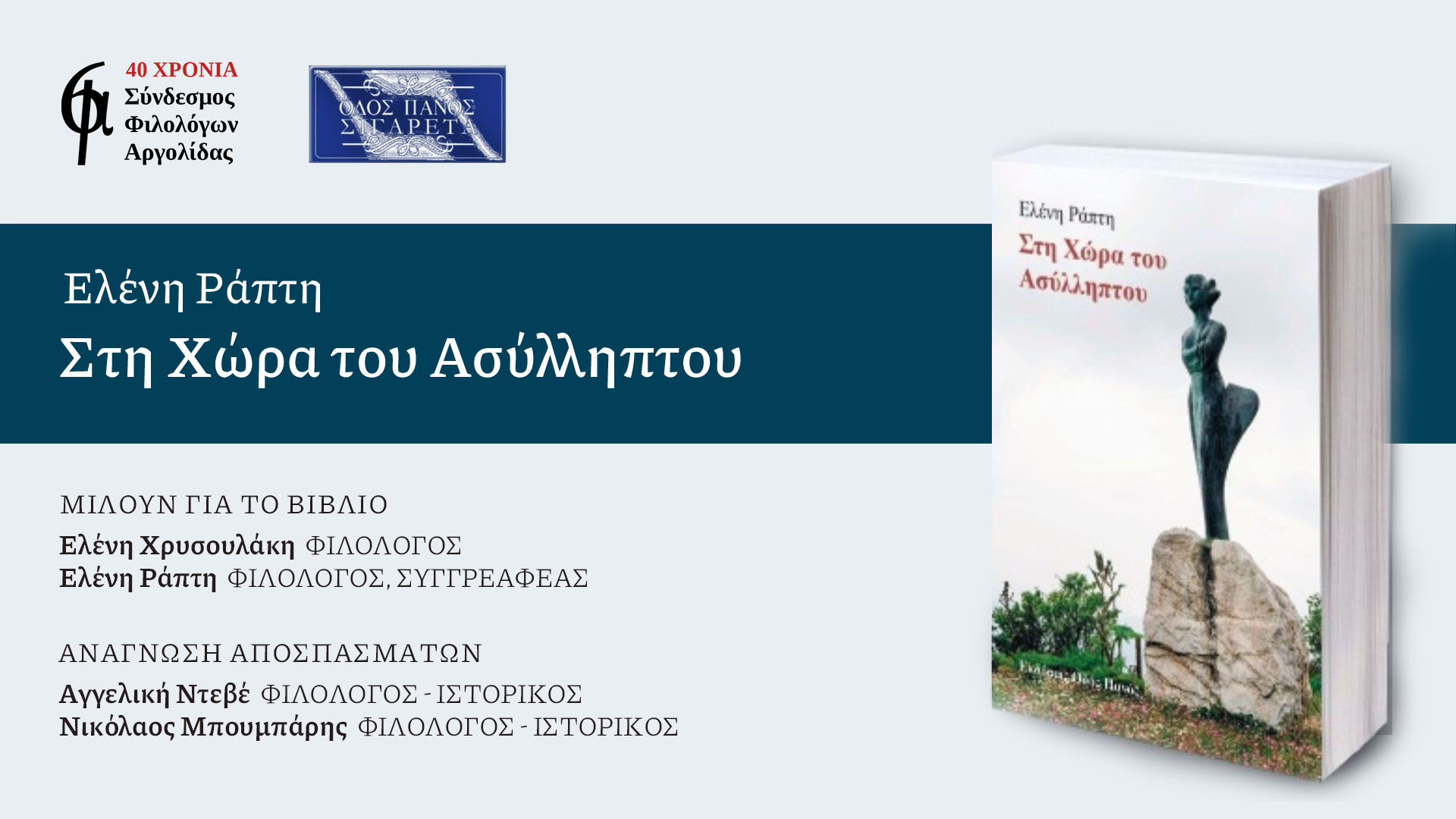 Ο Σύνδεσμος Φιλολόγων Αργολίδας, οι Εκδόσεις Οδός Πανός και το Βιβλιοπωλείο Αποσπερίτης σας προσκαλούν στην παρουσίαση του βιβλίου «Στη χώρα του ασύλληπτου» της Ελένης Ράπτη.