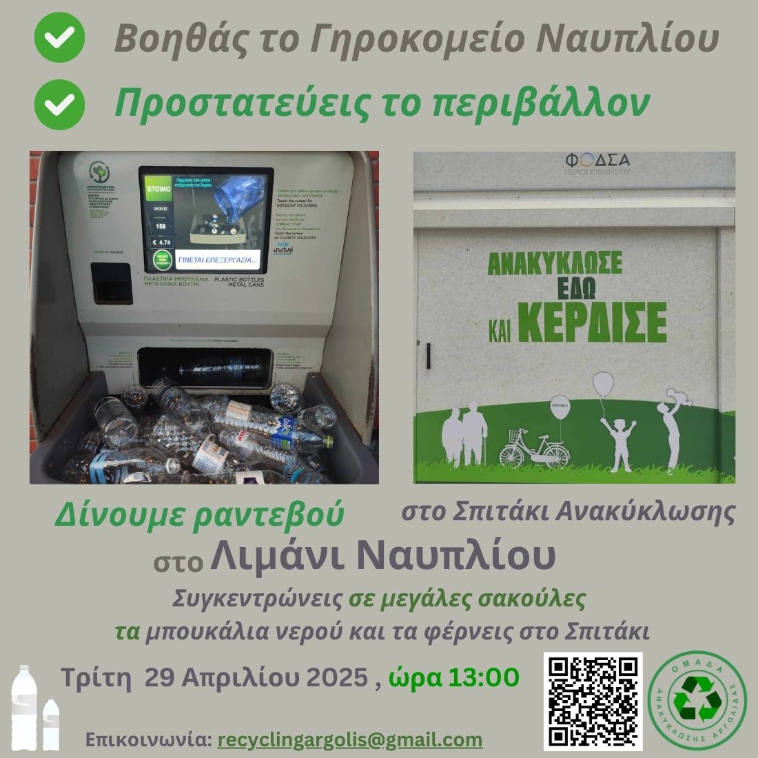 Η Ομάδα Ανακύκλωσης Αργολίδας σε καλεί να συμμετέχεις ενεργά στην επόμενη δράση της! Ραντεβού την Τρίτη 29 Απριλίου 2025 στις 13:00, στο σπιτάκι της Ανακύκλωσης στο λιμάνι του Ναυπλίου.