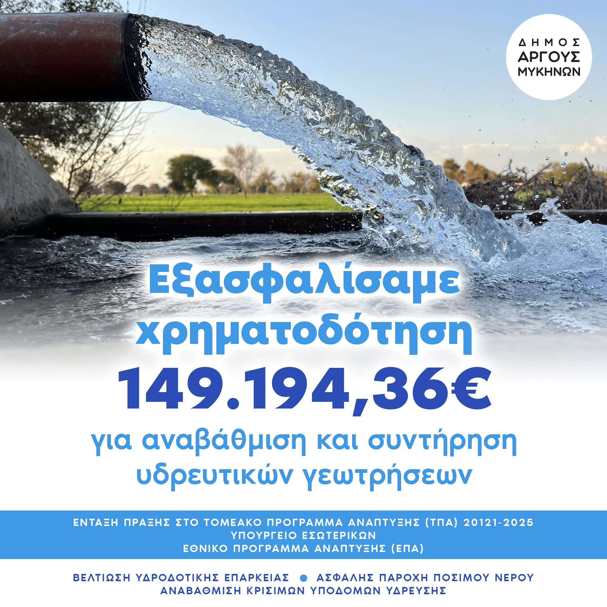 Ο Δήμος Άργους – Μυκηνών εξασφάλισε χρηματοδότηση ύψους 149.194,36€ για την αναβάθμιση και συντήρηση των υδρευτικών γεωτρήσεων, μέσω της ένταξης της σχετικής πράξης στο Τομεακό Πρόγραμμα Ανάπτυξης (ΤΠΑ) του Υπουργείου Εσωτερικών 2021-2025, στο πλαίσιο του Εθνικού Προγράμματος Ανάπτυξης (ΕΠΑ).