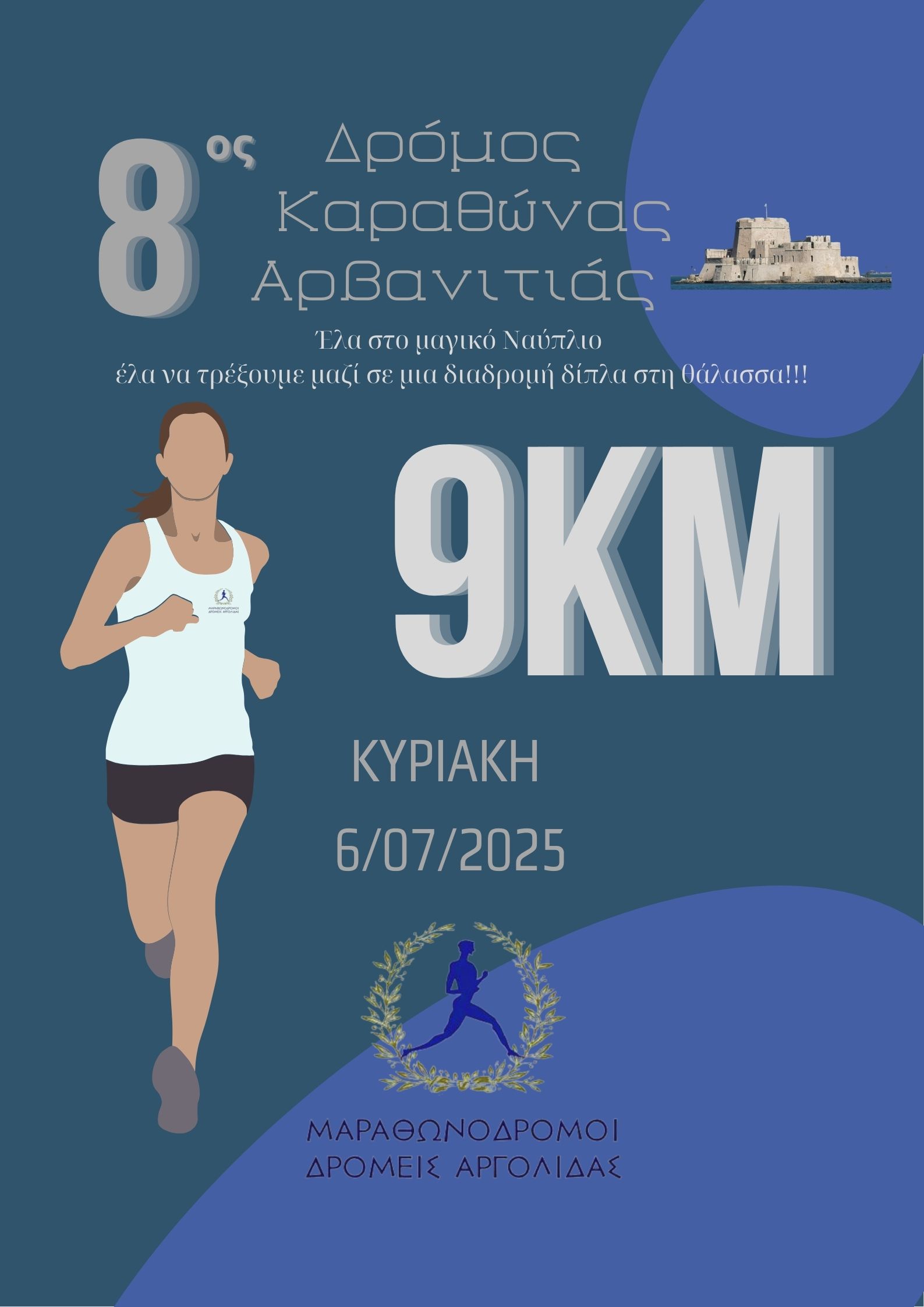 Ο Σύλλογος Μαραθωνοδρόμοι Δρομείς Αργολίδας, μέλος της Ε.Ο.Σ.Λ.Μ.Α – Υ, σας προσκαλεί να ζήσετε μια μοναδική εμπειρία δρομικού αθλητισμού. Την Κυριακή 6 Ιουλίου διοργανώνει τον 8ο Δρόμο Καραθώνας Αρβανιτιάς, μια διαδρομή 9,1 χιλιομέτρων δίπλα στη θάλασσα, στο μαγευτικό Ναύπλιο.